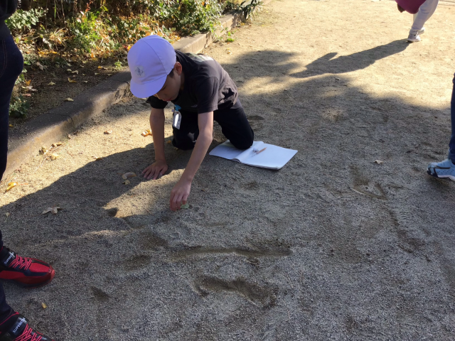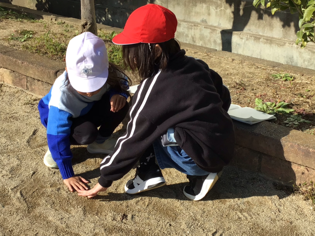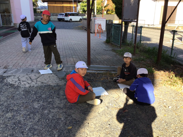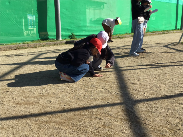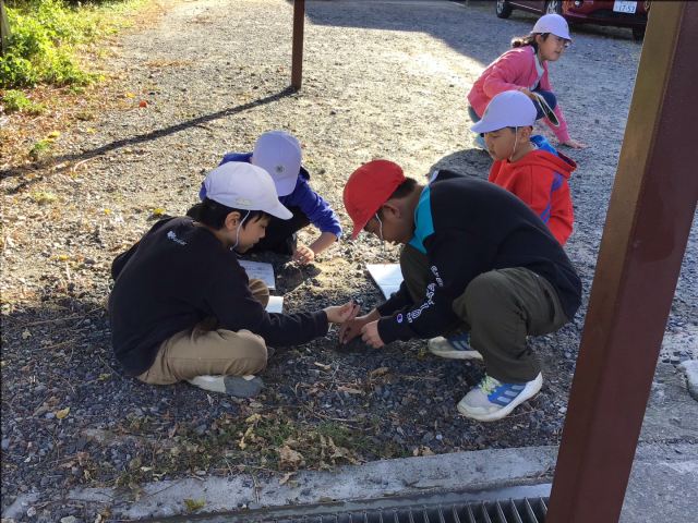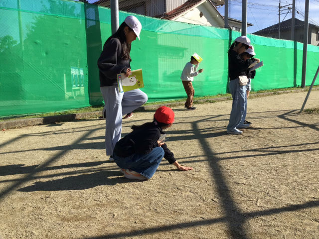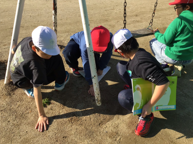 理科の学習の様子です。日なたと日かげの地面の様子を観察しに行きました。手で触り、感じた温かさや、湿り気など、たくさんの気づきを話すことができました。この次は、温度計で実際の温度をはかってみましょう。