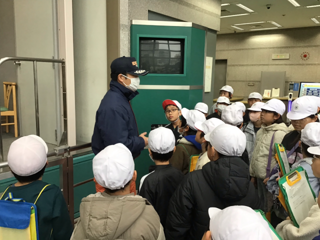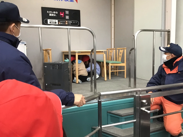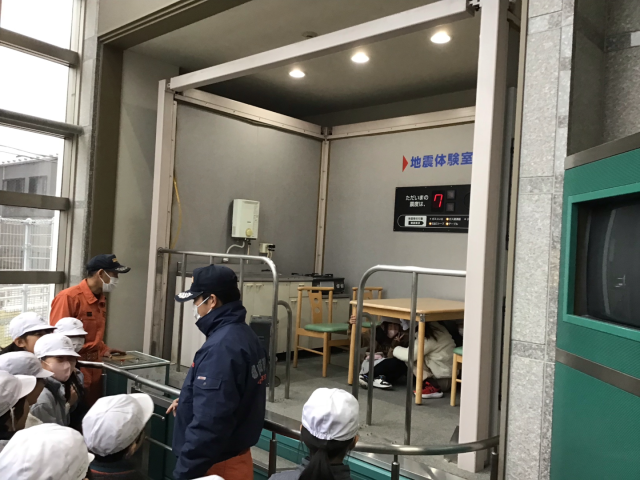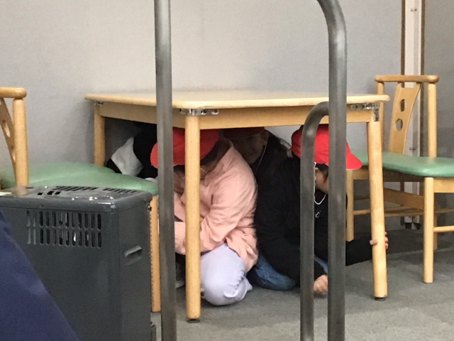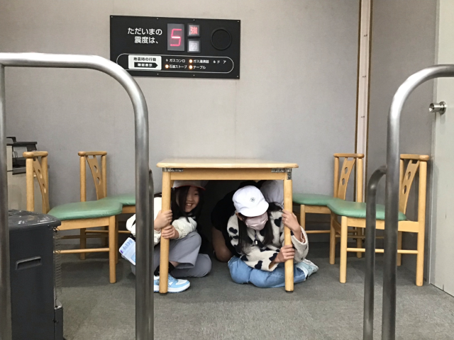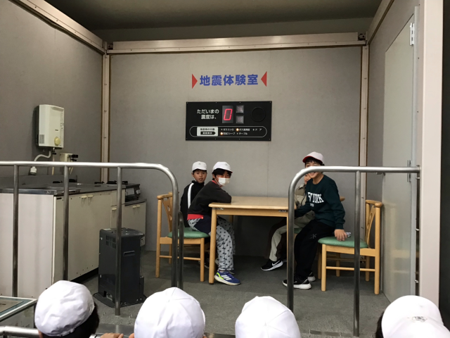 地震体験の様子です。自分たちで震度を選び、地震を体験しました。子どもたちは、机にすばやく隠れていましたが、頭を隠すことを忘れてしまいがちでした。一番守らなくてはいけないのは「頭」ということを今日みんなで再確認しました。