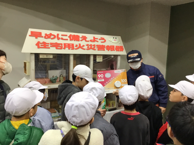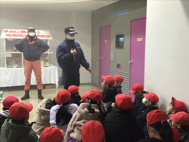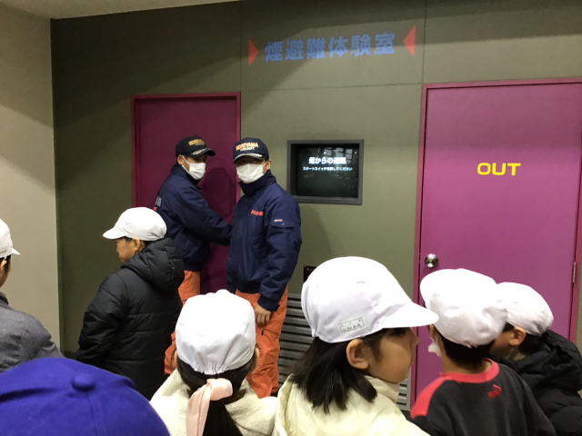 煙体験もさせていただきました。煙は上に行くので、下のほうを歩くことや、ハンカチやマスクをして直接煙を吸わないようにすることなどを教えていただきました。今日の煙は安全なものです。甘い香りのする煙でした。中から出てきた子どもたちは、「何も見えなかった」「こわかった」と話していました。煙の怖さが分かり、貴重な経験ができたと思います。