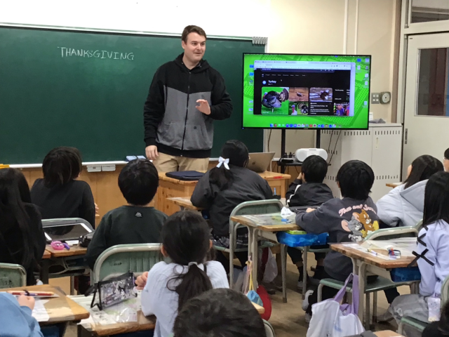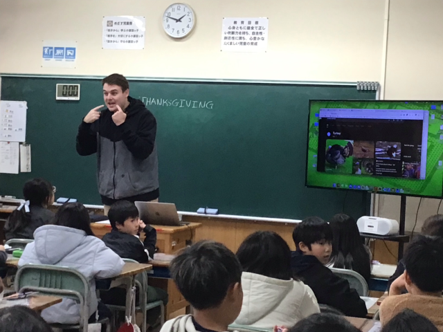 AETの先生がアメリカの行事である「サンクスギビング」について教えてくれました。感謝祭のことです。収穫や日々の恵みに感謝する祝日で、家族や友達が集まり、ご馳走を食べるそうです。その時に食べるターキー(七面鳥)について鳴き声を教えてもらっていました。他国の文化を知ることができた時間でした。