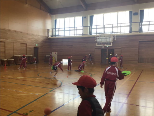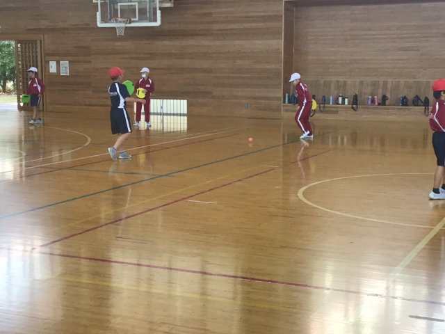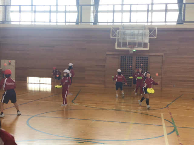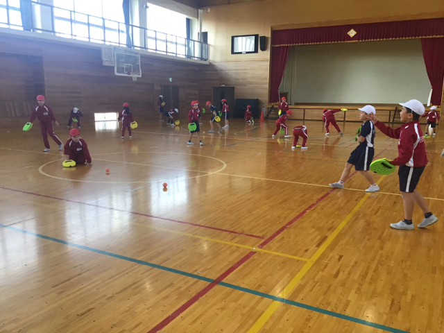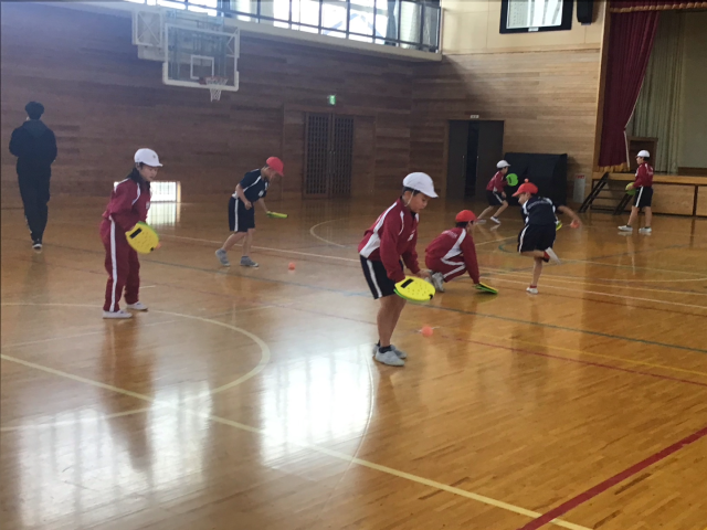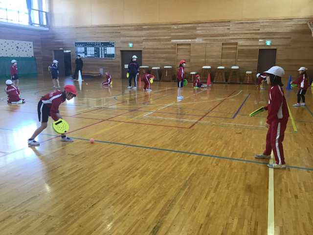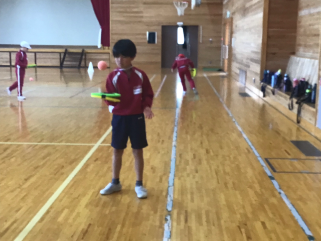 今日は、テニピンとの出会いの1時間目。ボールを使って上にバウンドさせたり、ドリブルしたり、あんたがたどこさをしたりしました。ボールに慣れたところで、転がしラリーをしました。とっても上手にできたので、今日の学習の最後は、相手が言った色の面を使ってラリーをしました。「すっごく楽しい!!」「はじめて知った!」「まだやりたーい!!」と大喜びの子どもたち。寒い日でしたが、汗びっしょりになるほど、活動していました。