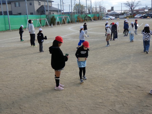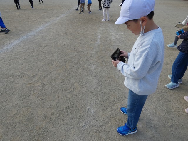 太陽の光を反射させる学習。鏡のいろいろな性質にも気付いたようです。太陽は、5校時になったら雲に隠れてきてしまい……。