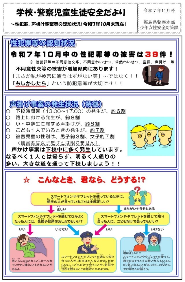 学校・警察児童生徒安全だより11月号が届きました。子供の事故防止のため、ご覧ください。