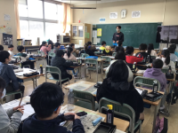 3年生になってはじまった習字の学習! 真剣な表情で、「元」の文字を書く3年生。ポイントを確認しながら、何枚も書いていました。