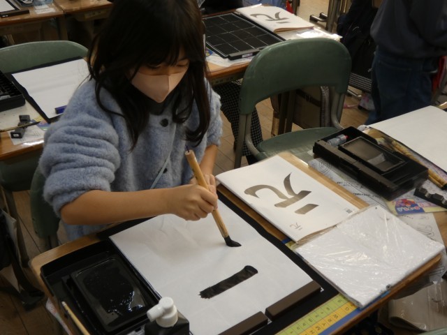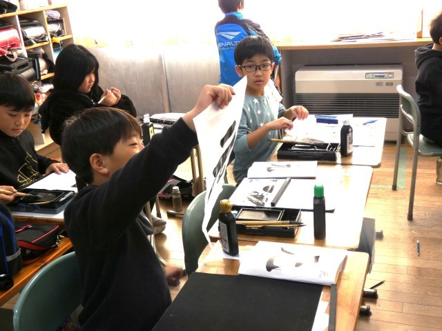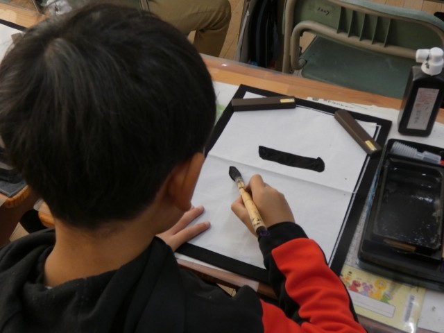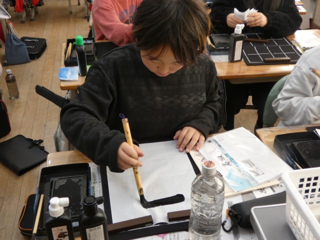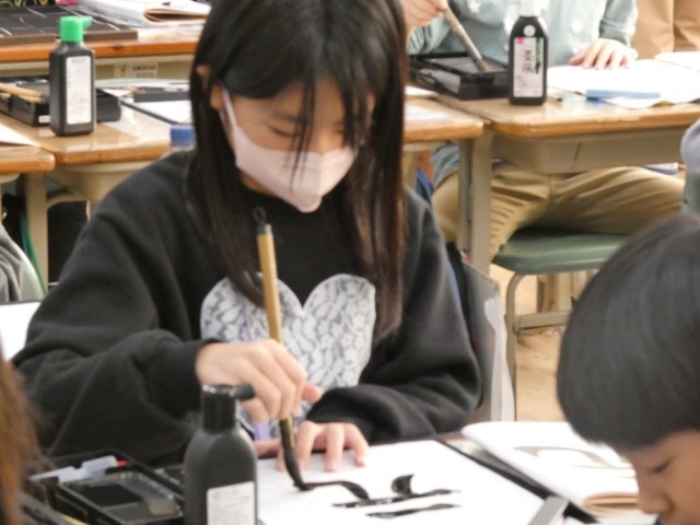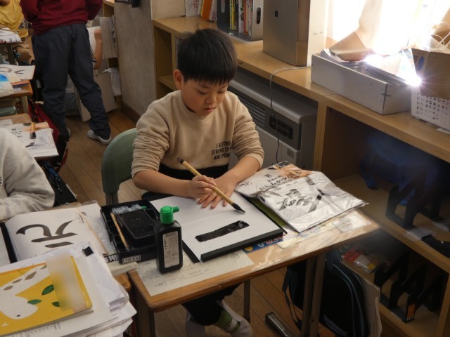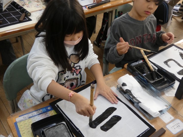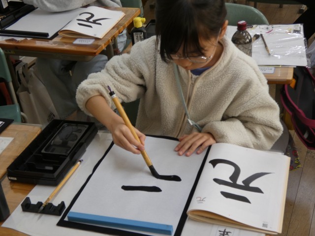 3年生になってはじまった習字の学習! 真剣な表情で、「元」の文字を書く3年生。ポイントを確認しながら、何枚も書いていました。