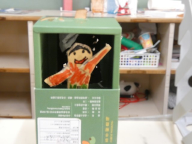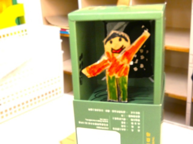 たんぽぽ1学級の教室訪問をしていたら、すてきな作品があったので紹介します。エレベーターだそうです。後ろには穴があって、きれいに光が入ってきます。ボタンも描いてあって、細かいところまでよくできた作品です。