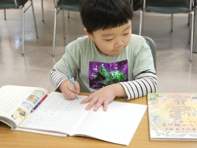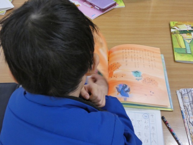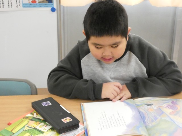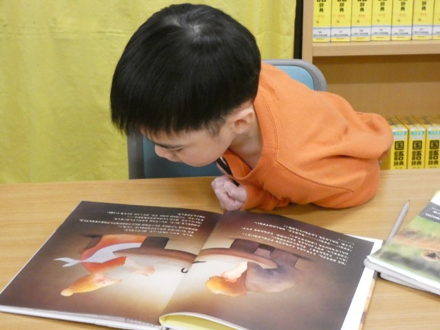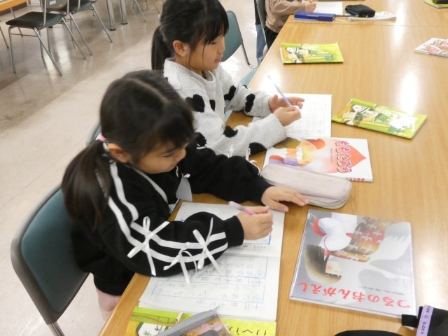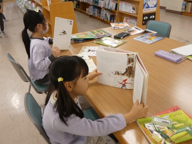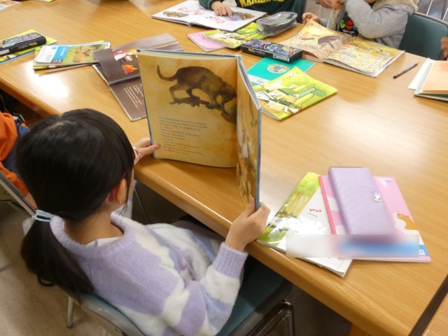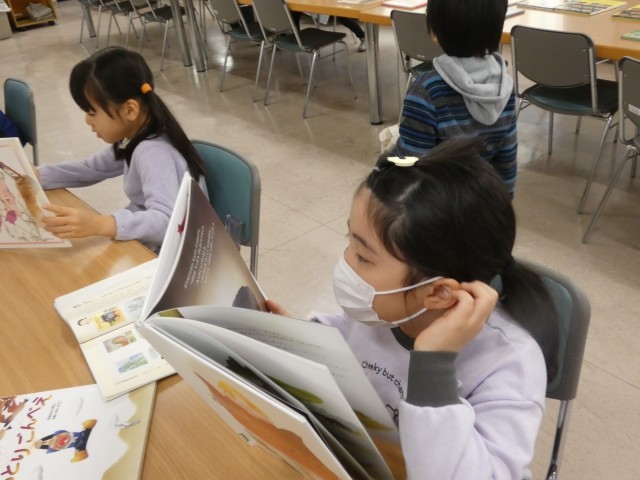 1年生は、図書室で昔話を読みました。図書室にあるたくさんの昔話の中から、自分の読みたい本を選び、集中して読んでいました!