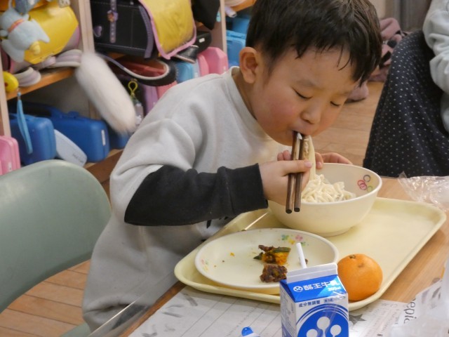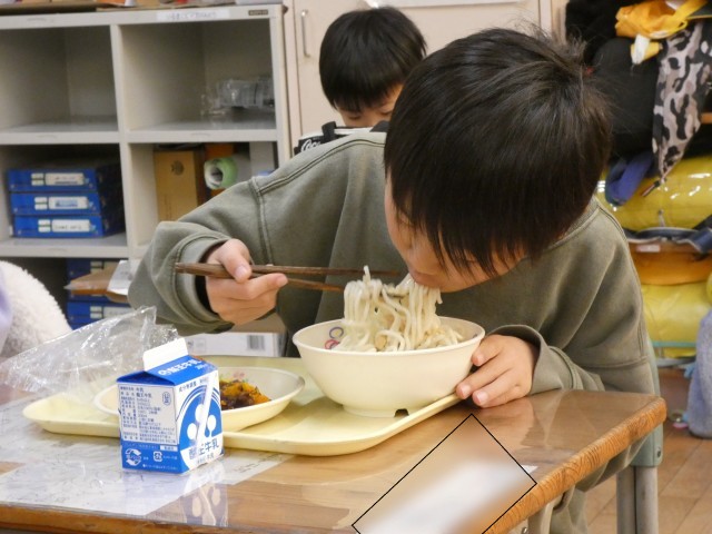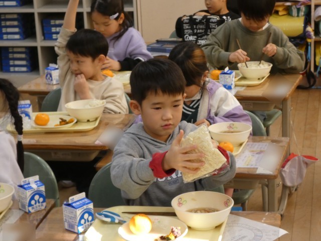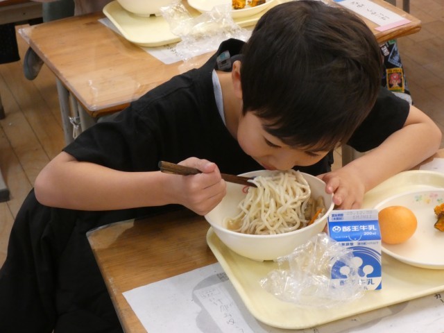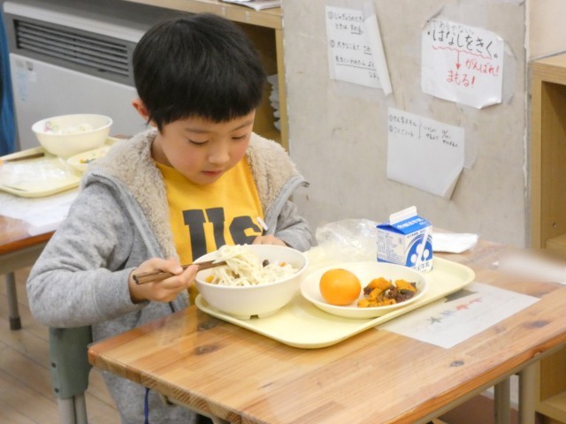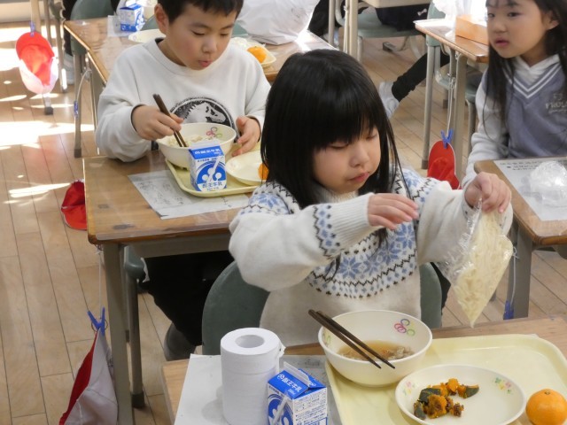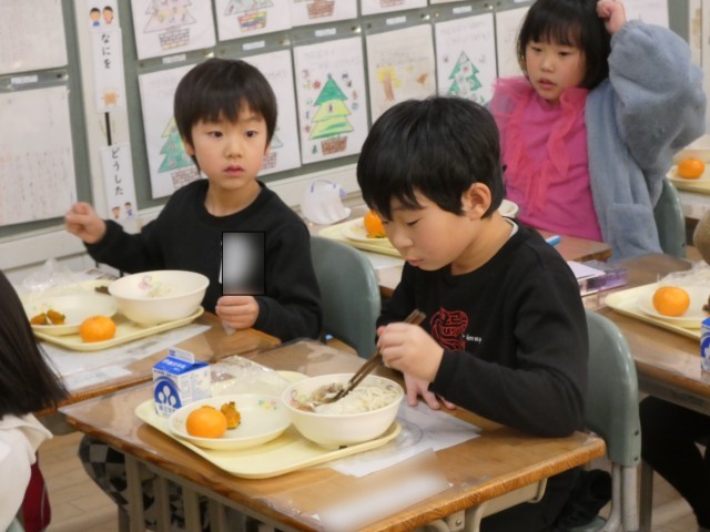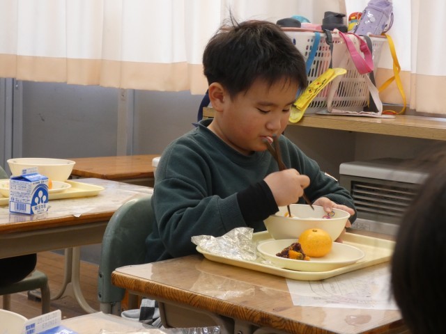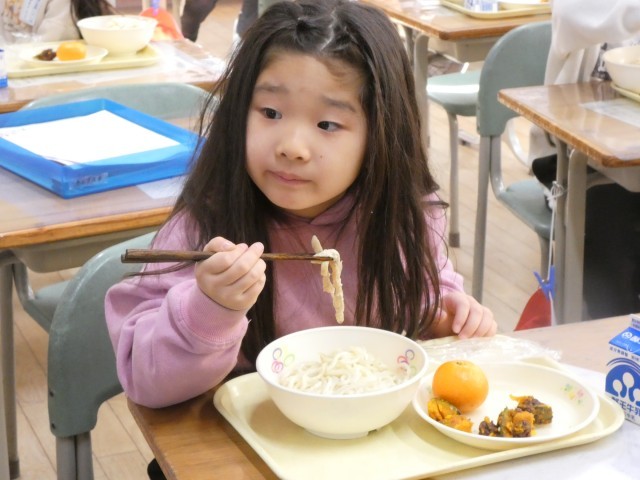 早いもので、2学期の給食は、今日が最後になりました。今日の献立は、冬至カボチャ、きつねうどん、ミカンでした。冬至カボチャを食べながら、「おいしい!」の声があちらこちらから聞こえてきました。2学期もおいしい給食を作ってくださった調理員の方々、ありがとうございました。