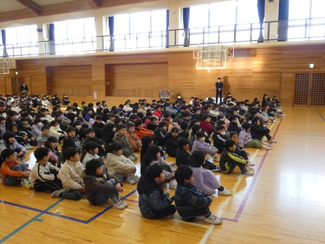 冬休みに気を付けてほしいこととして、家族のために、お手伝いに進んで取り組んでほしいことと、交通事故や不審者による被害事故、火の事故、水の事故などの「事故に遭わない」ために、約束やきまりを守って、「自分の命」を大切にしてほしいことについて話しました。