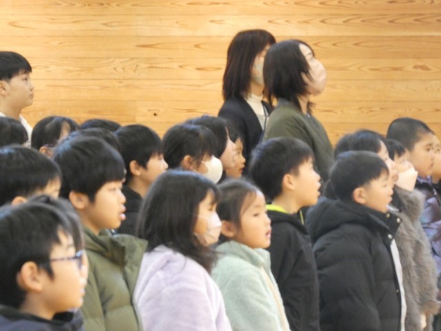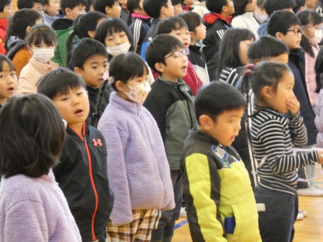 また、終業式の中では、各学年の楽しかった思い出と、特設音楽部の児童が本校の大先輩、西田敏行さんの歌を郡山市立美術館いっぱいに響かせたことが忘れられないことになったと話しました。縦割り班清掃では、全校生が協力して「誰かのために」頑張る姿を見ることができて嬉しかったので、これからも誰かの力になる、誰かの役に立つ行動を続けてほしいと話しました。