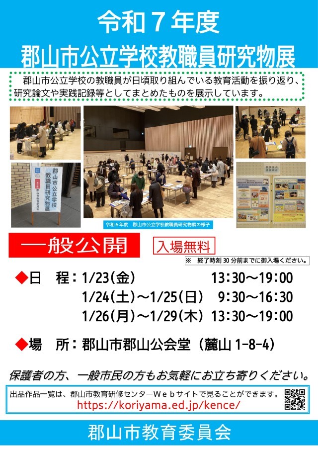 郡山市立学校では、子供たちの学びが充実するように、学校の実態・子供の実態に合わせた様々な研修を積み重ねています。その成果をまとめた研究物展が行われますので、ぜひご覧ください。