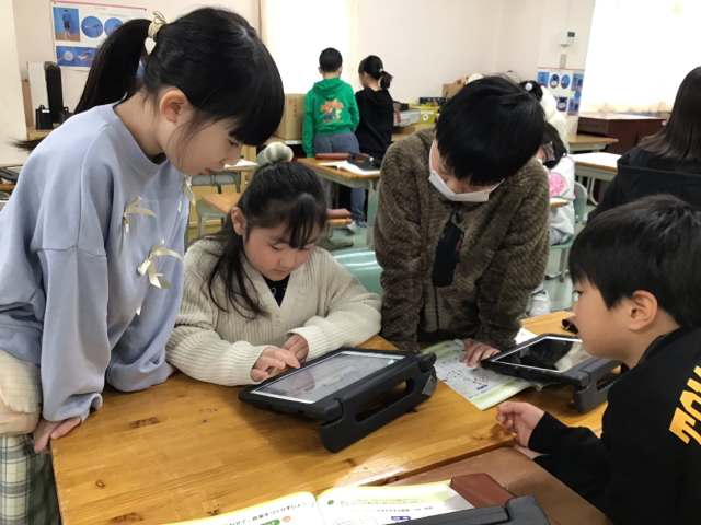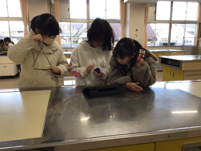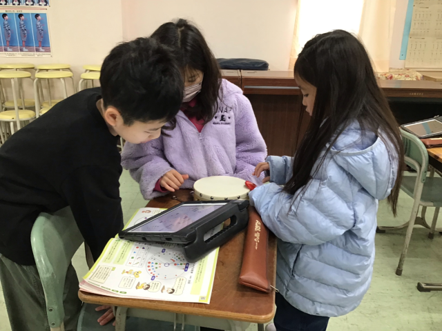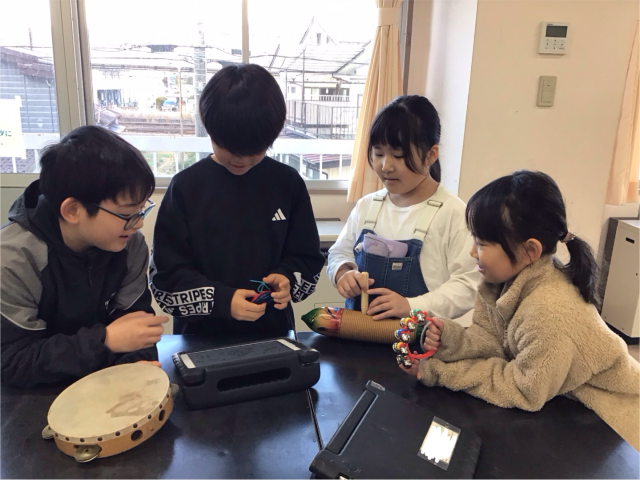 楽しい楽しい音楽の「創作」の授業です。自分たちで自分の思いを音にすることは、音楽の一番の楽しみだと思います。今日は決められた秒数の中で、それぞれの楽器を決められたところで鳴らします。「わくわくする音楽」「ドキドキする音楽」「時計の音楽」グループごとにテーマも様々です。タブレットで何度も確かめて、実際に楽器を持って練習していました。来週は、録音して発表会をします。