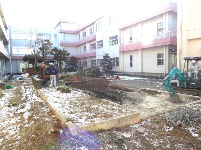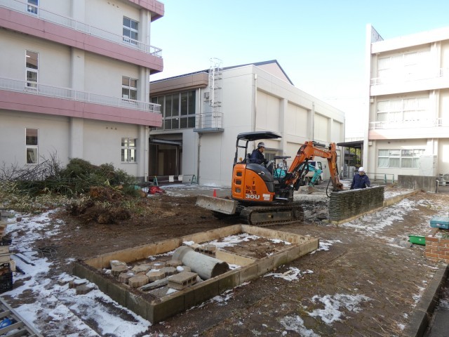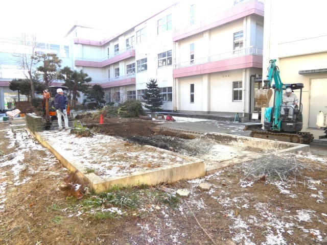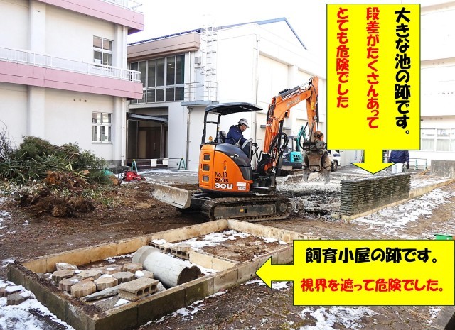 現在、飼育小屋を撤去し、段差のあった池の跡のコンクリートを壊して、平らにするための作業を進めています。