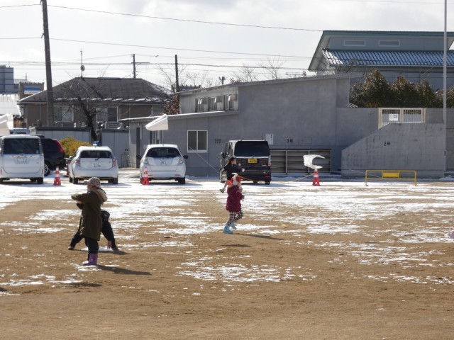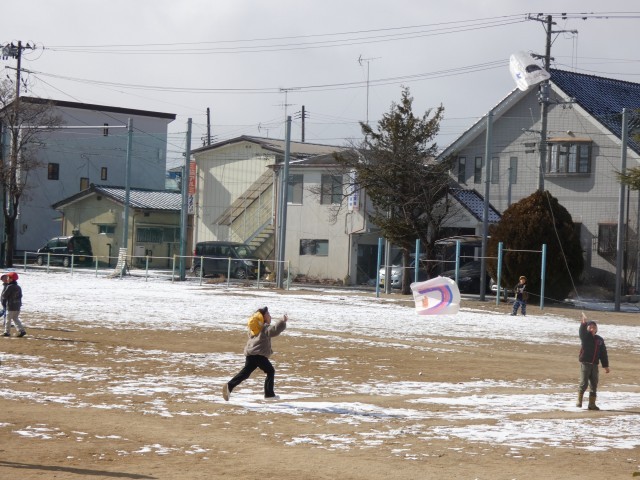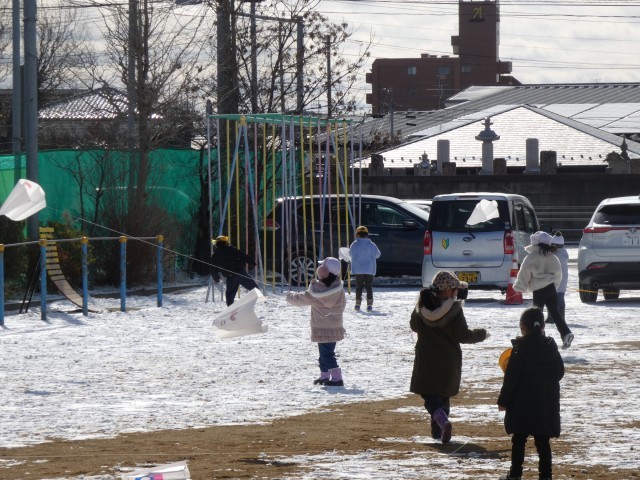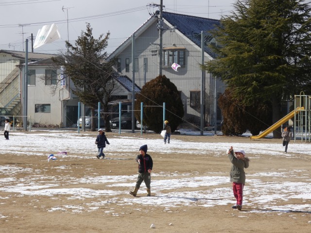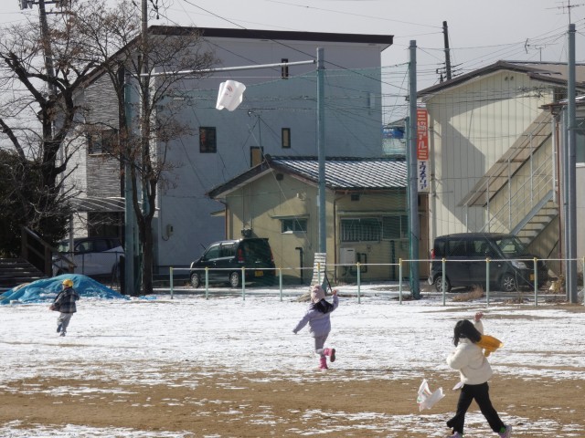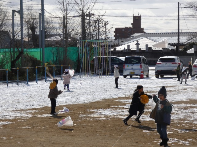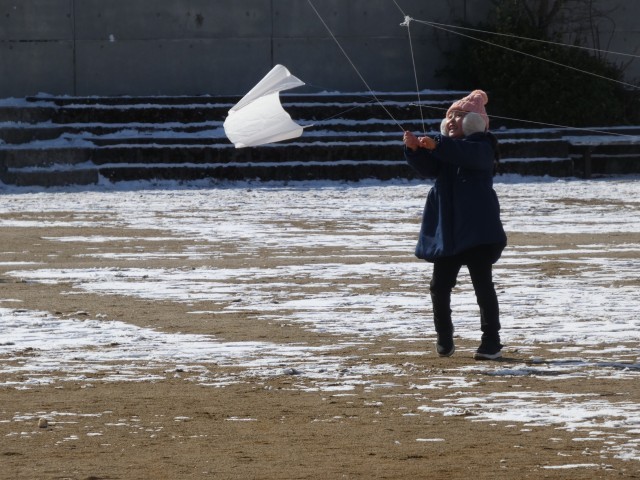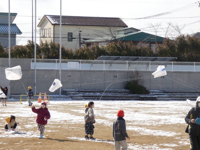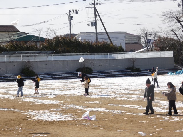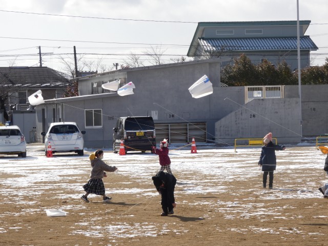 1年生が、生活科で冬の遊びをしていました。今回は、校庭で凧あげにチャレンジ!