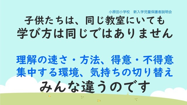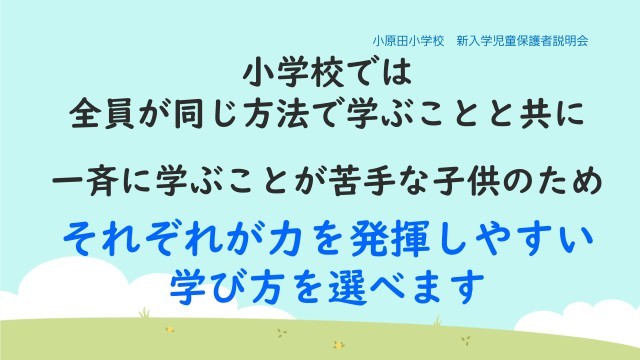 小原田小では、「全員が同じ方法で学ぶ」ことを大切にするとともに、それぞれの子供が自分の力を発揮しやすい学び方を選べる工夫をしています。