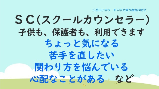 また、SC(スクール・カウンセラー)は、子供も保護者も利用できます。困ってから行く場所ではなく、ちょっと気になる、苦手を治したい、家庭での関わり方で迷っているなど、気軽にご相談ください。