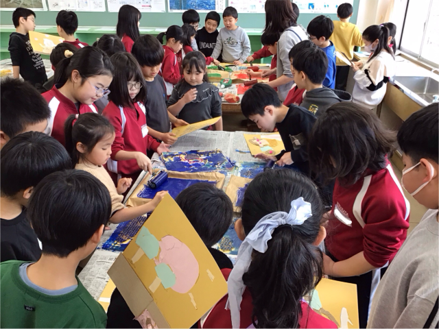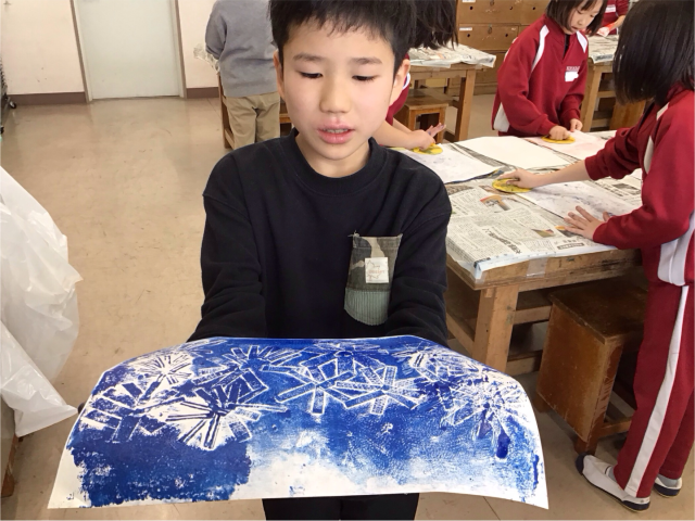 図画工作科の時間の様子です。シールタイプの版画は経験したことがあったそうですが、インクとローラーを使った版画は初めて。しっかりと担任の話を聞いて、ルールを守って版画の学習をすることができました。片付けもとっても上手でした。