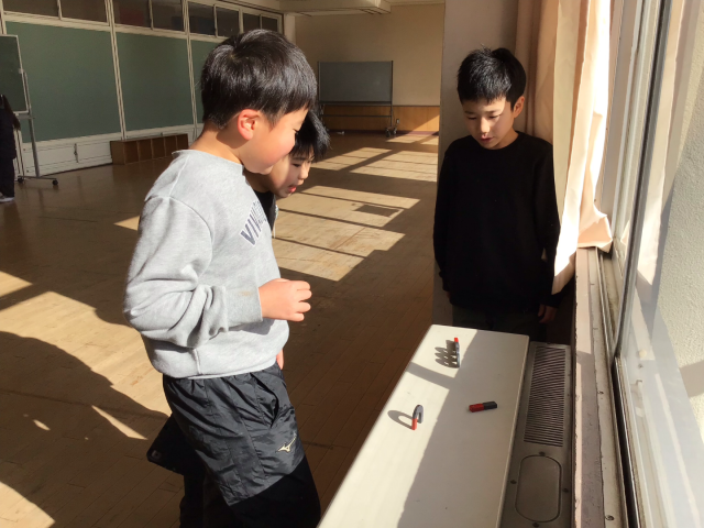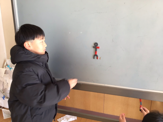 磁石の学習が始まりました。今日は1時間目だったので、磁石で遊んだり、どんなものが磁石にくっつくのかを調べたりしました。教室を出て特別教室の物も調べていました。電気の学習の時、アルミ缶を削ったら電気が通ったこと、塗料で加工されているから電気が通らなかったことを思い出した子どもたち。黒板に磁石はつくけれど、チョークでコーティングしたらどうなのかな?という疑問をもち、さっそく確かめていました。