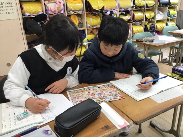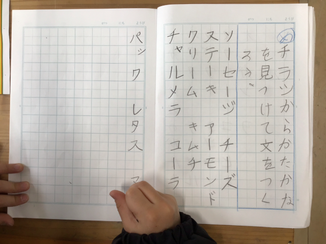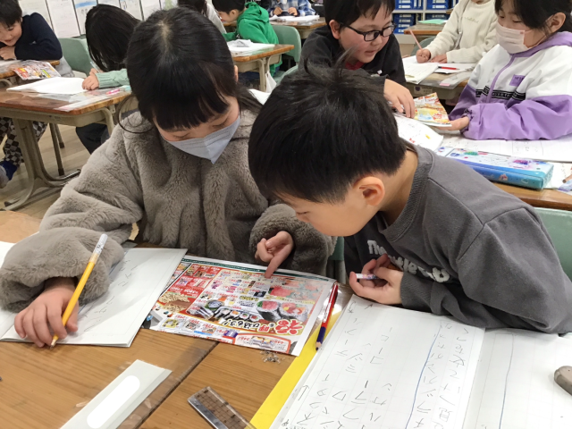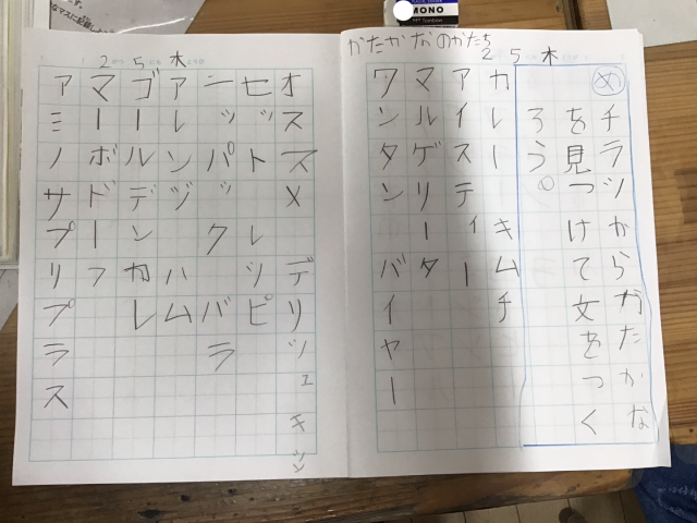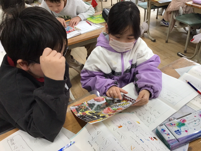 友だちと一緒に、チラシをよく見てかたかなを探し、ノートに書くことができました。ノート3ページ分もかたかなを見つけていた人もおり、一生懸命活動に取り組んでいました。