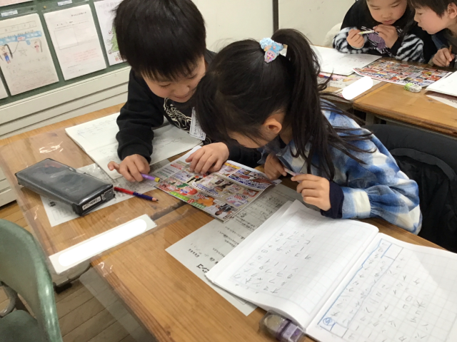 1年生は国語科の「かたかなのかたち」という単元で、チラシからかたかなを見つけて、文を作る学習に取り組みました。