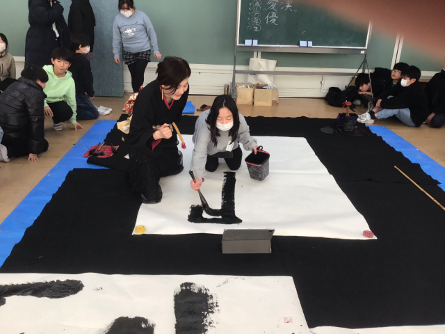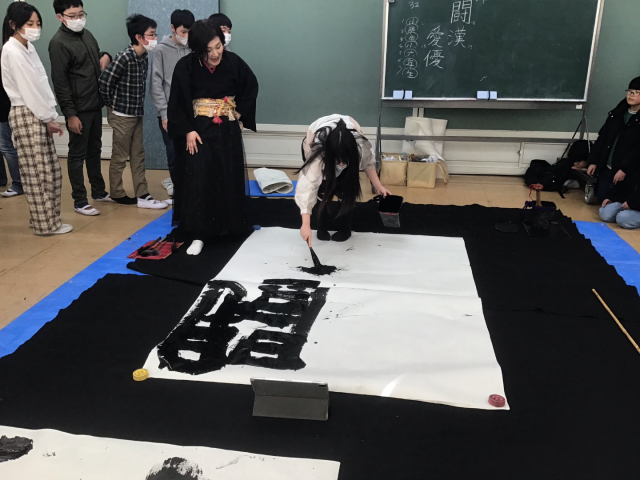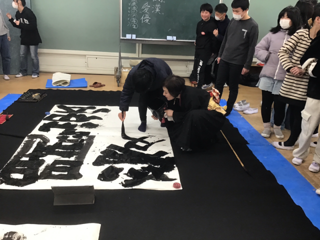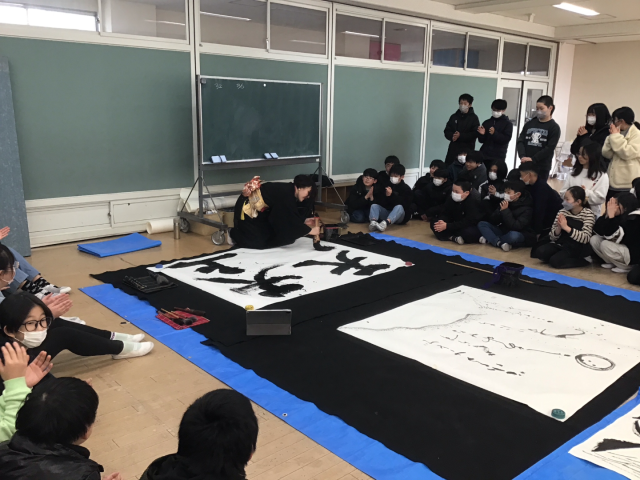 9日(月)に講師の先生に来ていただき、「書道の魅力」について学びました。目の前で迫力ある書道のパフォーマンスを見ることができました。また、自分たちで一人一画ずつ担当して字を書いたり、各クラスで考えた言葉を代表児童が実際に書いたりしました。書道に触れ、貴重な体験をすることができました。