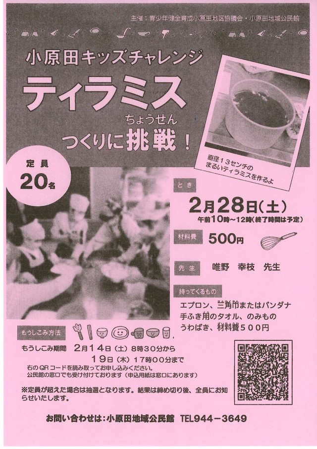 小原田地域公民館より、「ティラミスつくりに挑戦!」のお知らせが届きました。