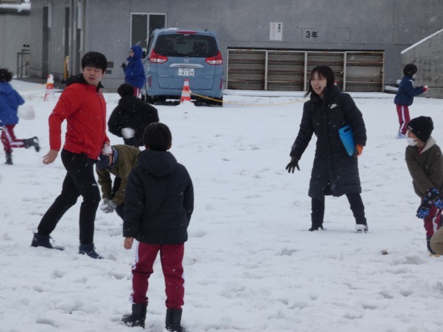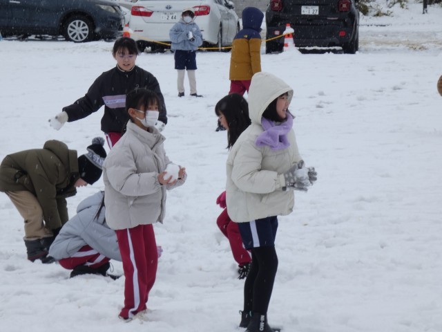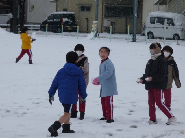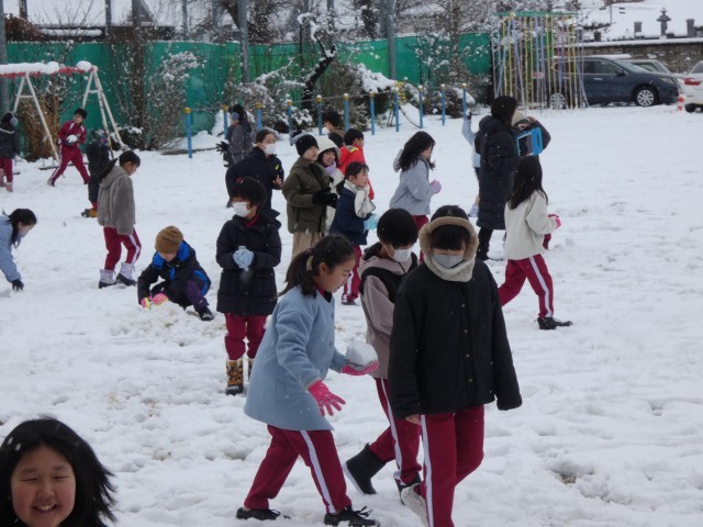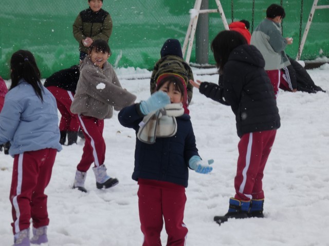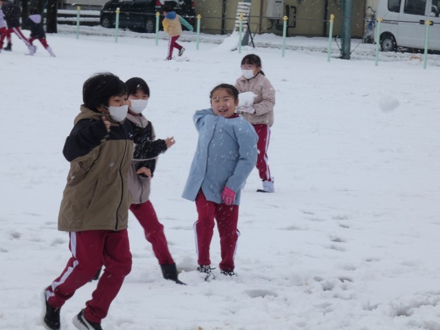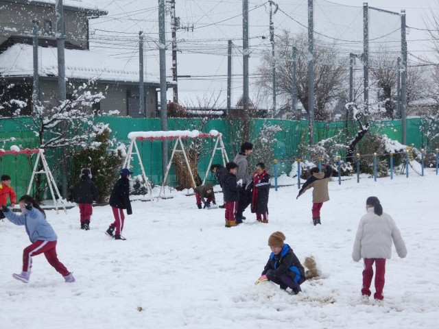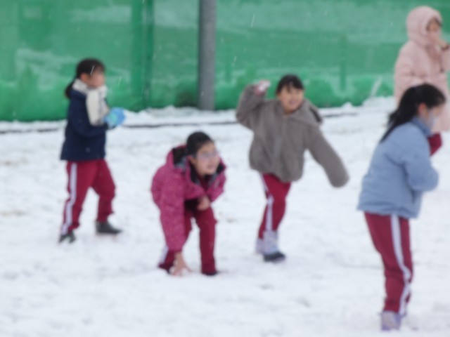 昨晩から降り積もった雪! 子供たちは大喜びで、校庭で遊んでいます!