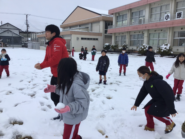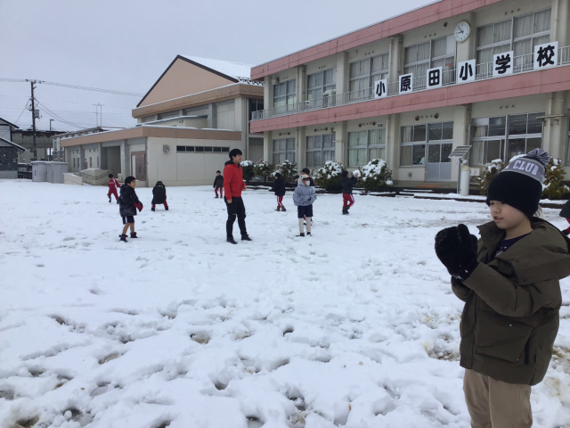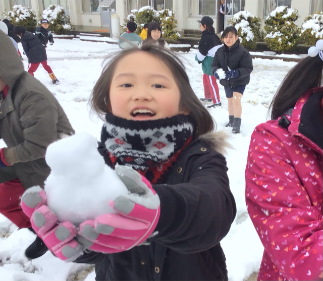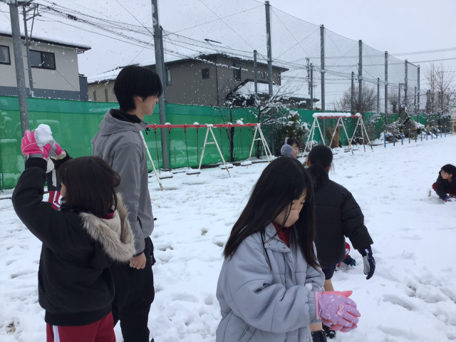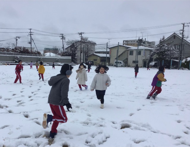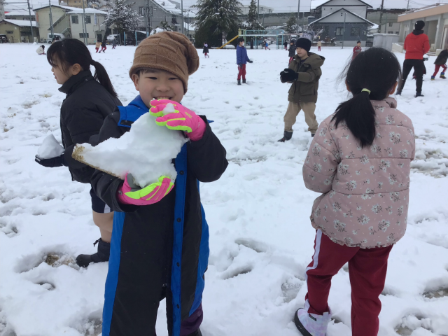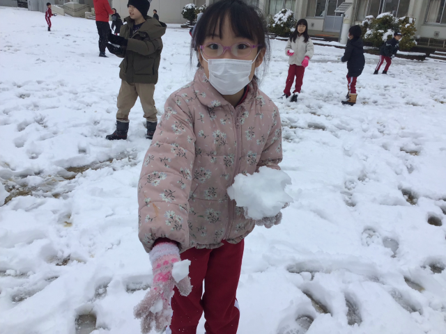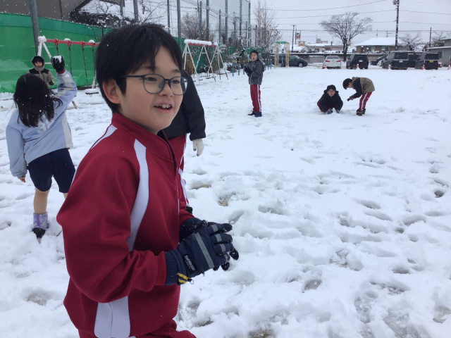 待ちに待った雪が校庭一面に積もり、大喜びの子どもたち。雪だるまを作ったり、雪合戦をしたりと雪遊びを楽しみました。冷たい雪の中でも子どもたちの表情は笑顔で溢れていました。夢中になって遊ぶ中で、服を濡らしてしまったお子さんもいました。教室でできるだけ乾くように努力しましたが、お洗濯など、ご迷惑をおかけします。