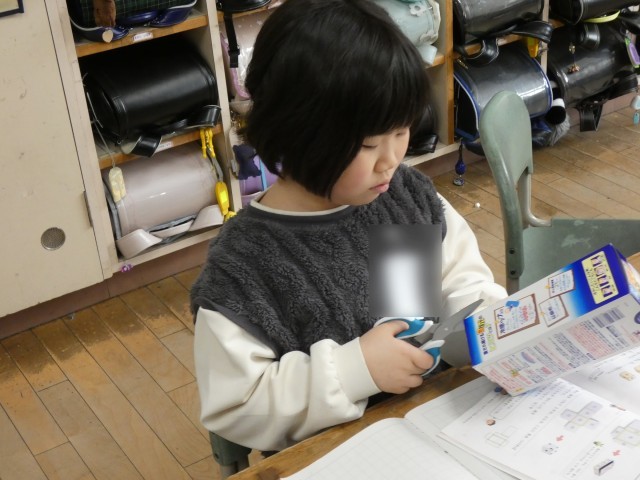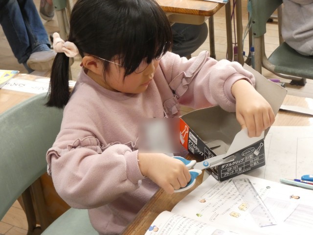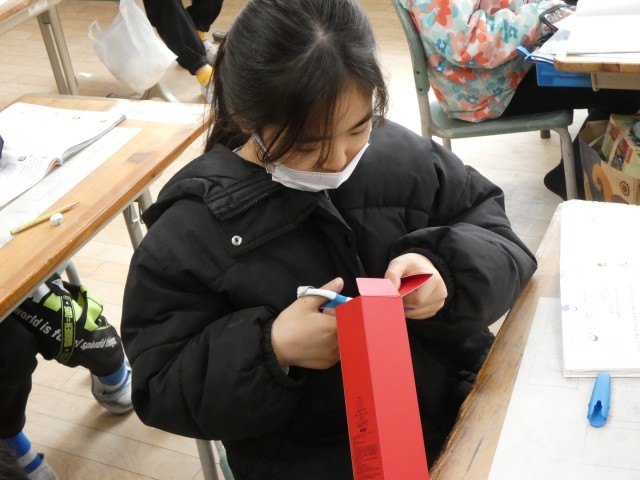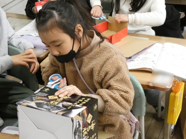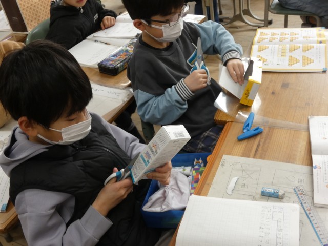 2年生は、箱を切り開くとどのような形になるのかを、箱を実際に切って調べていました。どんな形ができるのかな?
