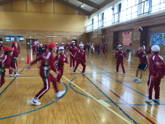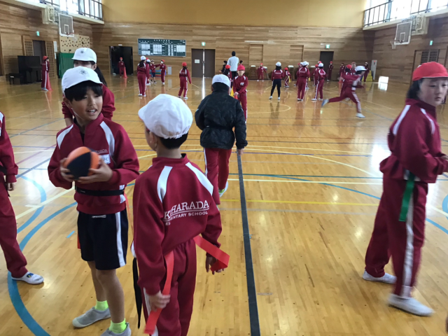 タグラグビーもまとめの段階に入りました。今日は、クラス混合戦。1組も2組も混ざって試合をしました。審判も自分たちでやっています。成長しましたね。