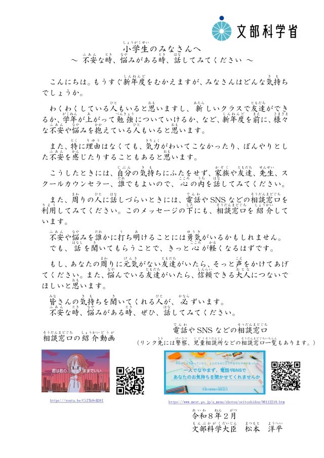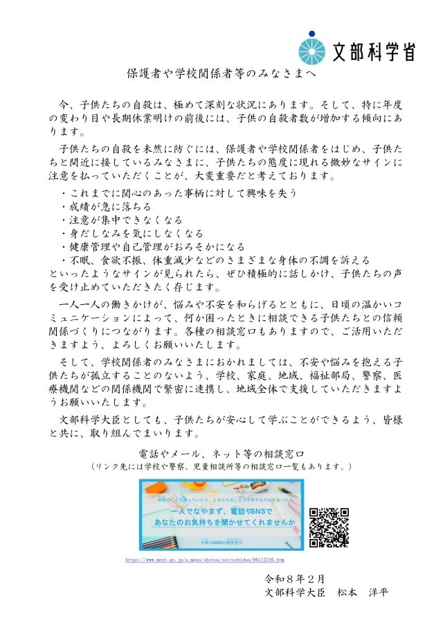 自殺予防に係る文部科学大臣メッセージが届きましたので、ご覧くださいますようお願いいたします。