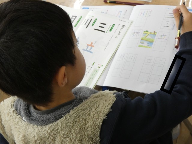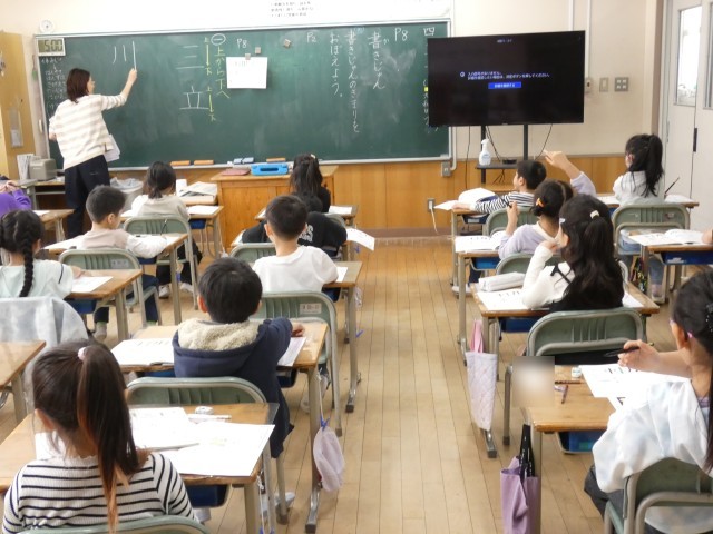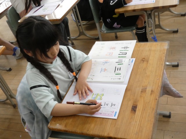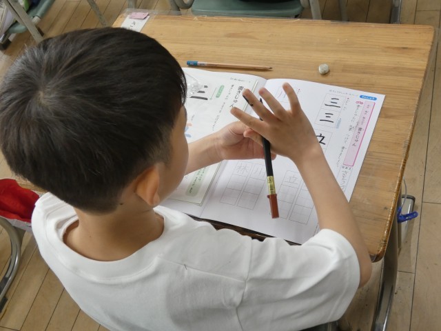 書写の時間の2年生の様子です。丁寧に、三、立、川、林の文字を練習していました。