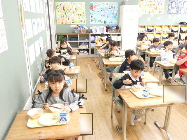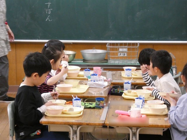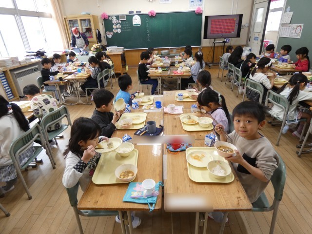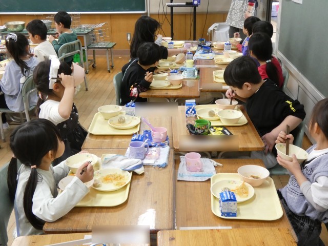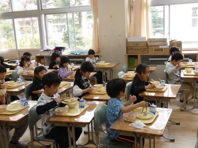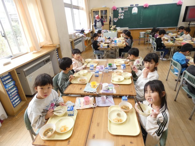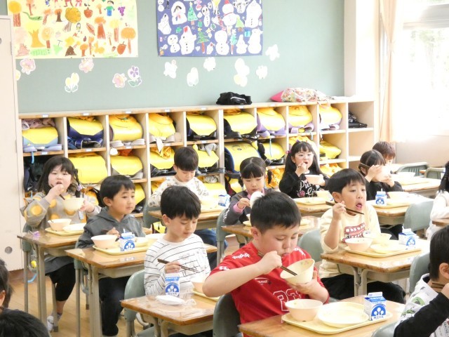 給食をもりもり食べる1年生!