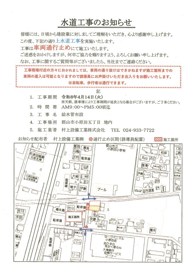 学校近く道路の水道工事による車両通行止めのお知らせ