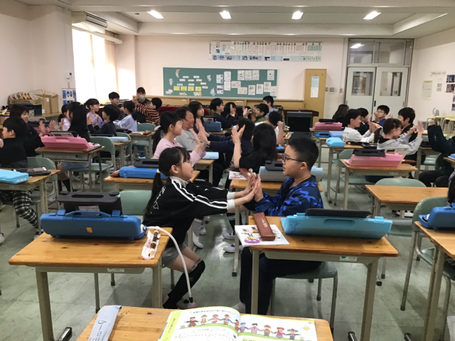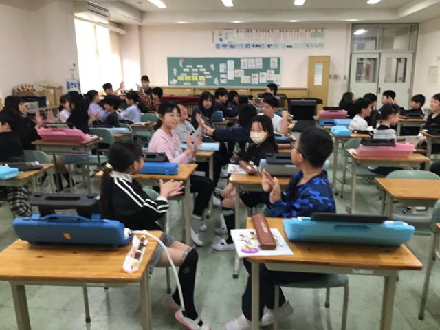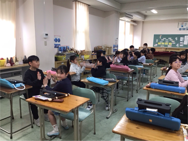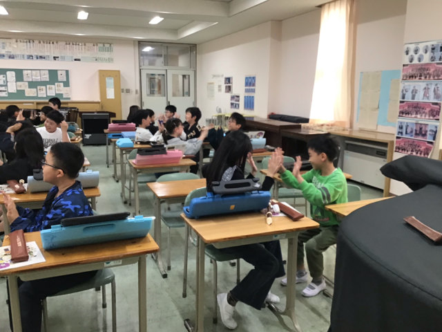 今日は音楽の授業開きをしました。みんなでリコーダーやドレミ体操をして、教科書にある1番最初の曲「小さな世界」をみんなで歌いました。途中から手遊びを入れて楽しく学習しました。体で音楽を感じることができて素晴らしいです。