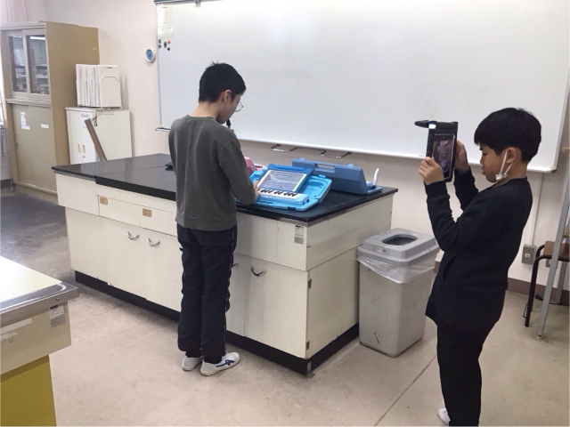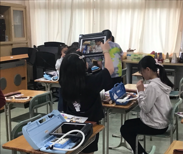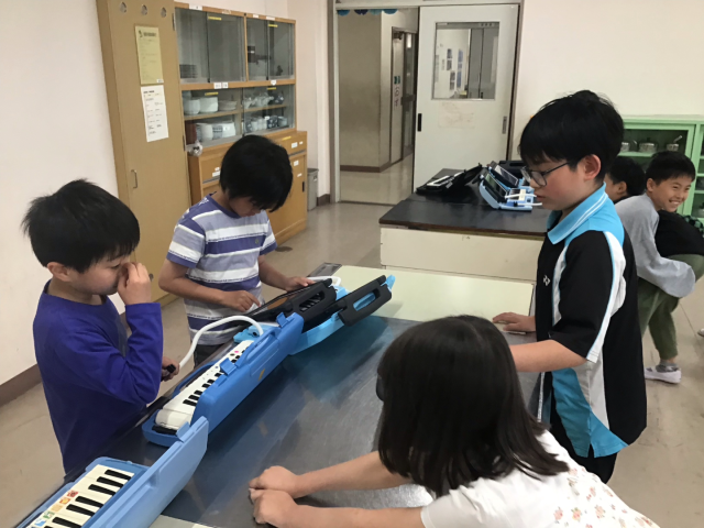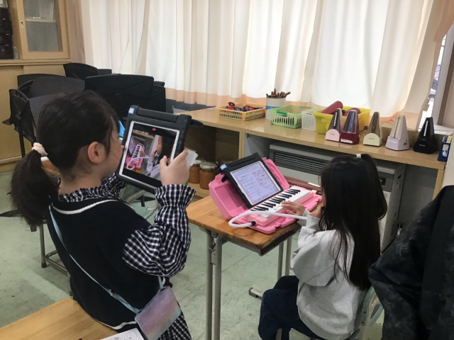 音楽科「いいことありそう」の学習をしています。先週から鍵盤ハーモニカのパートを練習しています。今日は、2部屋に分かれて鍵盤ハーモニカを演奏して友達に動画撮影してもらい、提出しました。みんな指づかいやリズムに気を付けて頑張って演奏していました。最後の「ドレミファソ ラシド♪」の指くぐりのところが難しかったですね。