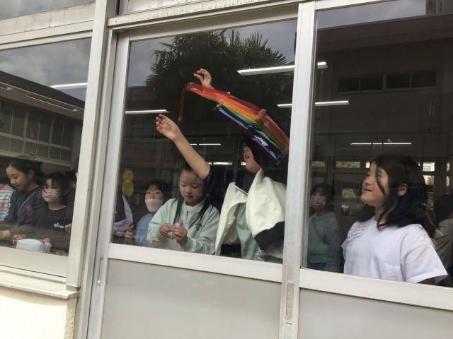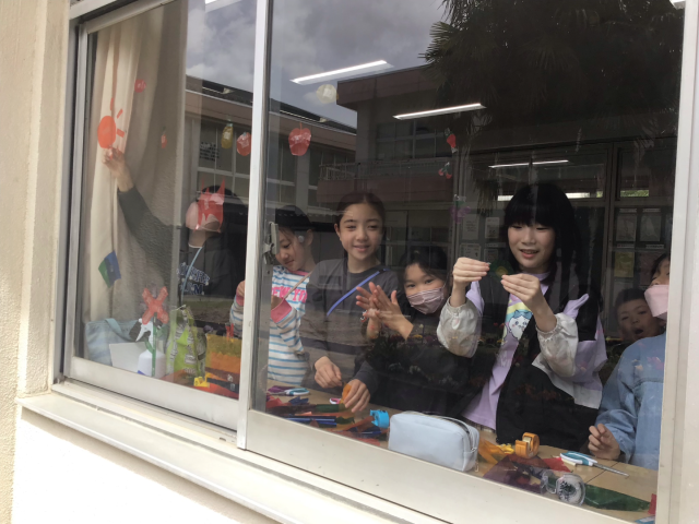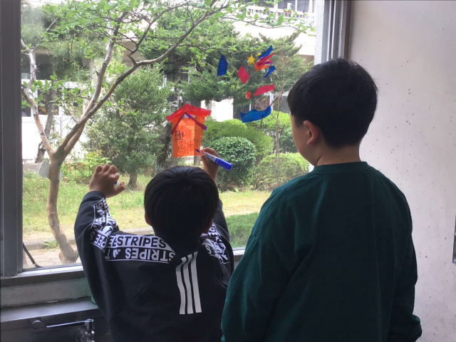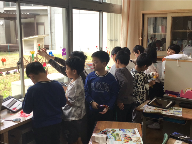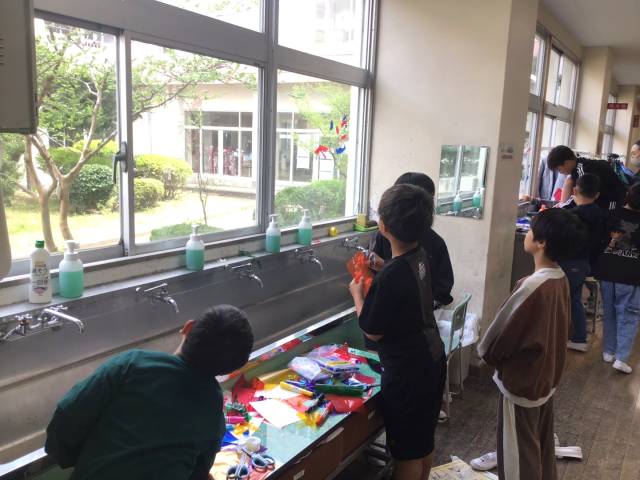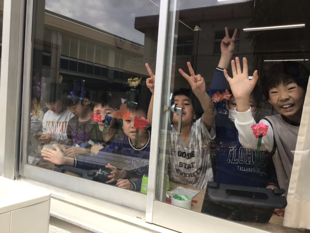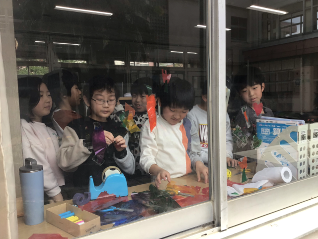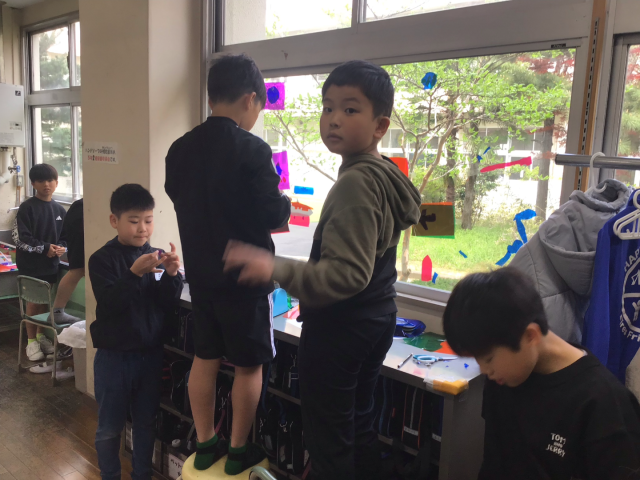 図画工作科の様子です。「まどをのぞいて」という学習をしています。窓に材料を貼って、窓の向こうの景色と材料を組み合わせる学習です。まだ制作途中のようです。どんな作品が生まれるのでしょうか。楽しみにしています。