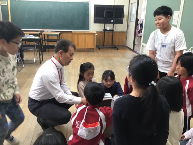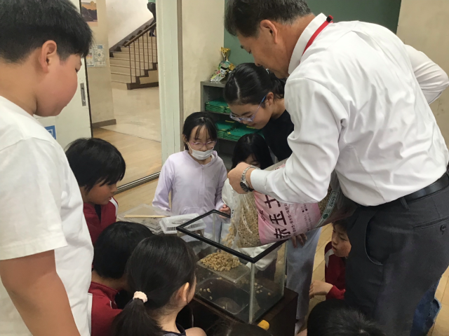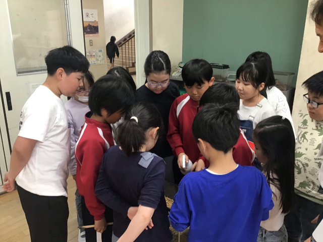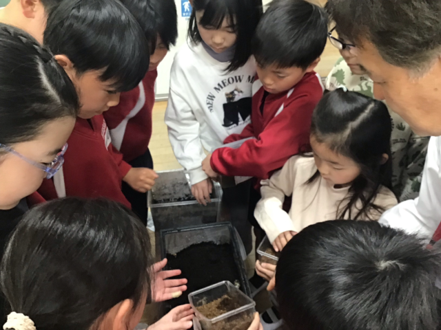 昨年飼っていたカブトムシが卵を産み、幼虫として育っていました。幼虫をもっと元気にうまくかえらせるために、カブトムシの幼虫に詳しい先生が、教えてくださいました。1組も2組も生き物係が大集合!脱皮できる空洞、蛹室(ようしつ)を上手に作れる環境を一緒に作ってくださいました。赤玉土の上に、腐葉土を乗せ、霧吹きをかけます。水槽の中も工夫し、ガラスに近いところに蛹室を作れるようにしてくれました。これから、どんな姿で成長するのか、見れますね。先生、おしえてくださり、ありがとうございました。