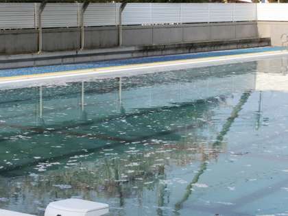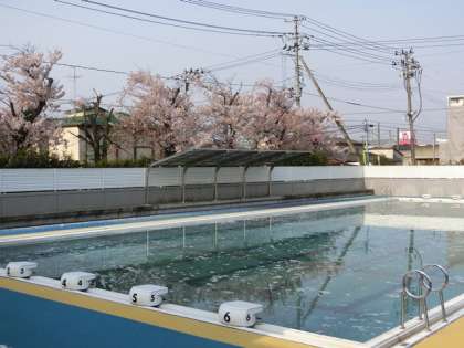 プールを見ると、桜の花びらが浮かんで、桃色に・・・。