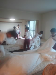 ベッドや布団を片付けて、朝の準備をしています