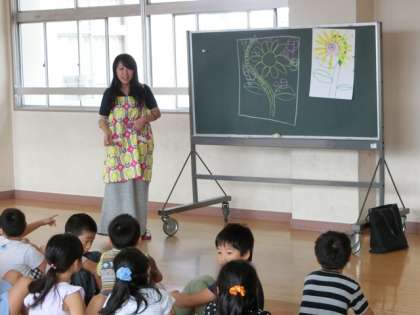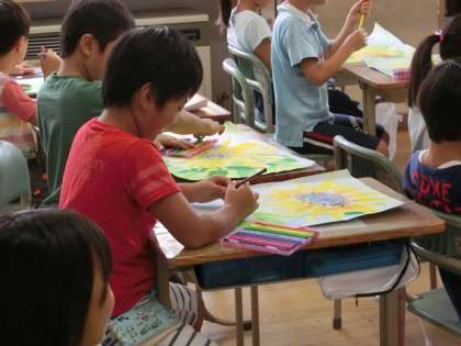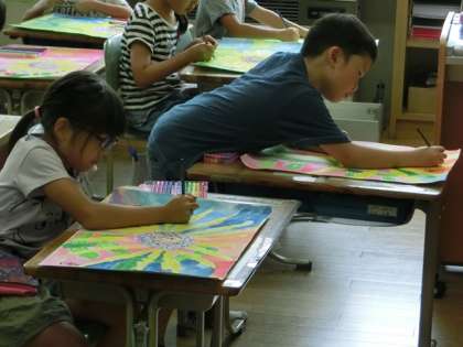 前回描いたひまわりの花に、楽しい世界を描いていきます。