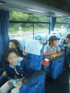 バスの中では、レク係が怖い話やクイズで盛り上がっています