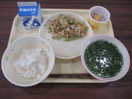 今日の給食は朝食モデル献立です。メニューは、麦ごはん、牛乳、納豆、ツナあえ、にらのみそ汁です。