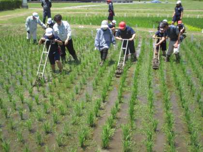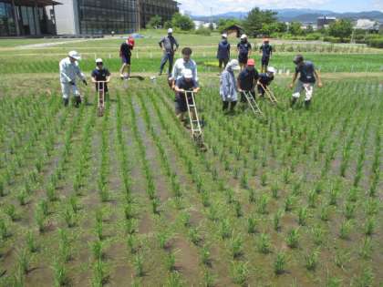 5・6年生は県農業センターを訪問し、田んぼの雑草とり体験を行いました。とても日射しが強く、暑い中での活動となりました。