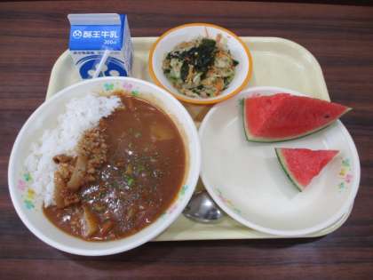 今日の給食の献立は、ハヤシライス、牛乳、わかめとツナのサラダ、小玉すいかです。