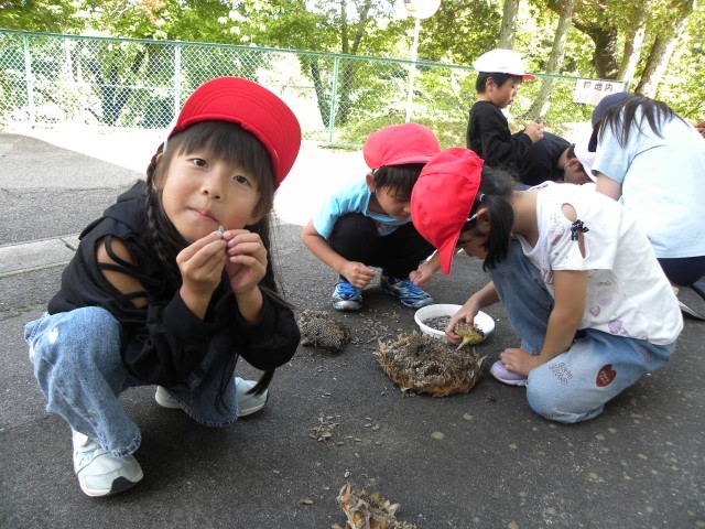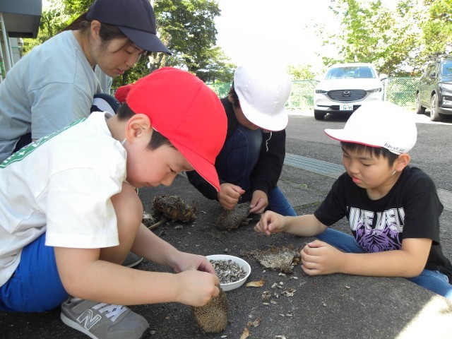今日から校内マラソン記録会に向けた全校練習がスタートしました。例年歩いてしまう子が多いということでしたが、どの子も音楽がなっている間、自分のペースで走り続けていました。素晴らしい姿です。さて、1年生が校舎裏で集まって何かしているな、とのぞいたら、ヒマワリの種を取って集めていました。日中はまだ暑いですが、確実に季節は移ってきています。