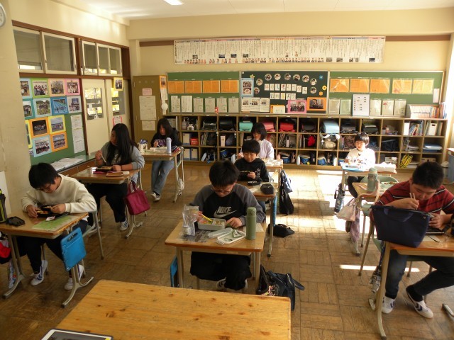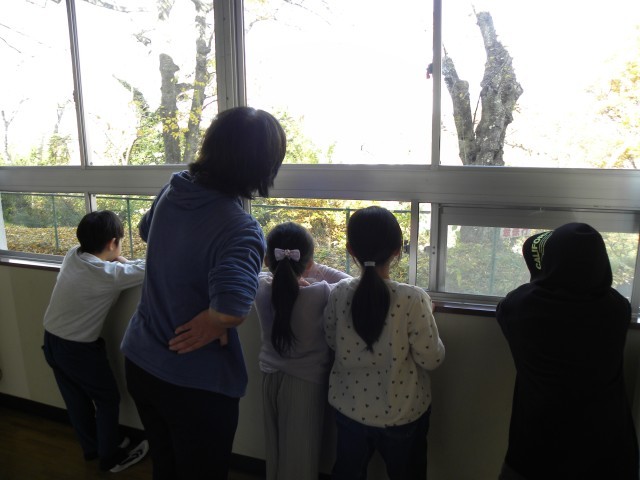 今日は小雨が降る、寒い一日でした。周辺の木々もすっかり色づき、赤や黄色などで学校を美しく彩っています。虹がでていたので、廊下に出て虹の色を観察している学年もありました。