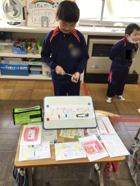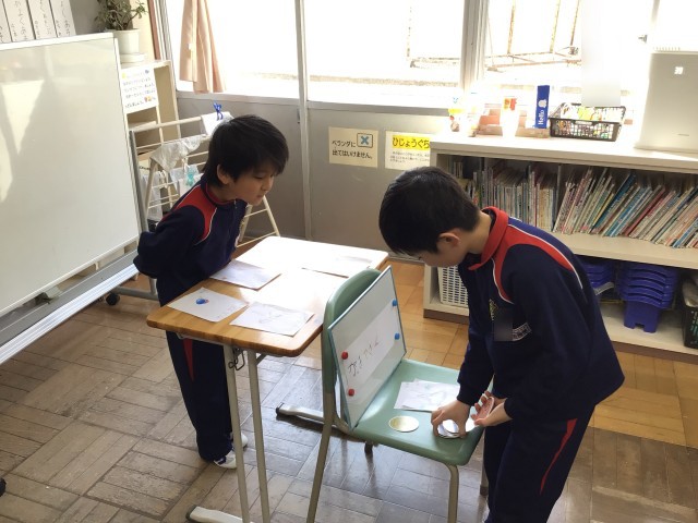 1年生教室をのぞくと、国語科の「ものの名まえ」の学習で、集めた言葉をカードにしてお店やさんごっこををしていました。店員さんとお客さんに分かれて、上手にやり取りしていました。