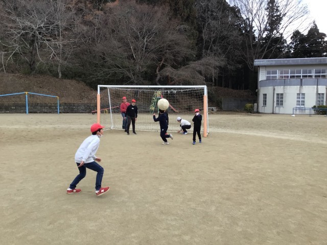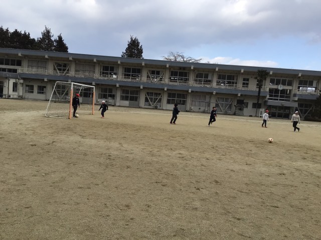 昼休みのようすです。まだまだ寒いですが、子どもたちは広い校庭をいっぱいに使って、のびのび元気に遊んでいます。サッカーをする子、鬼ごっこをする子、学年関係なく、一緒になって楽しく遊んでいます。