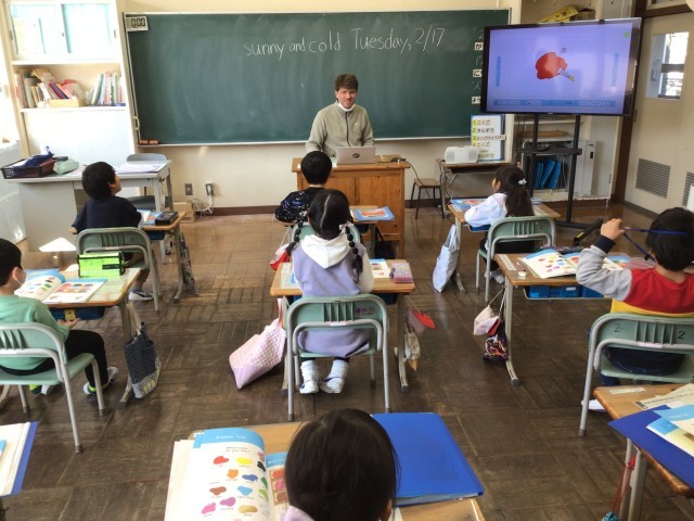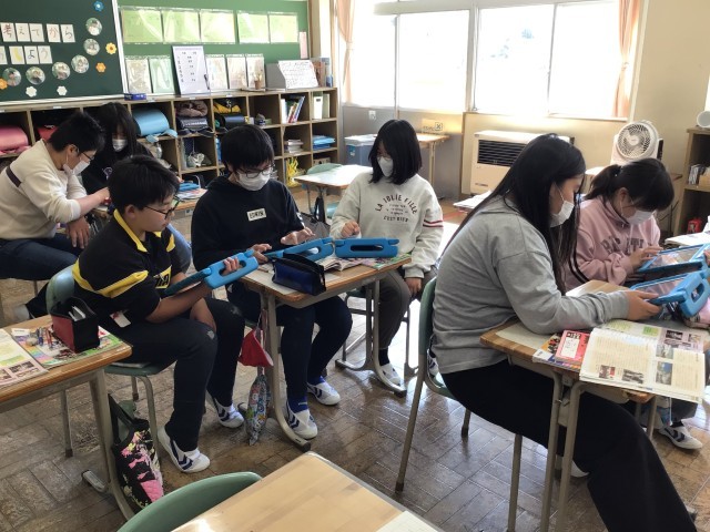 1・2年生は英語表現科の授業で、AETの先生と一緒に色の発音のしかたを勉強していました。学習指導要領での「外国語活動」は3年生からになっていますが、郡山市は文部科学省の教育課程特例校の制度で1・2年生から外国語を学んでいます。日本語発音の「れっど」や「おれんじ」などとの違いを声に出しながら学んでいました。6年生は社会科で、領土問題や環境問題、人権問題など、現代社会の課題についてグループごとに真剣に考えていました。